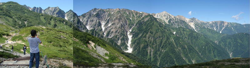| 2009年8月23日に、高2の次男を伴って八方尾根トレッキングに出かけました。白馬村の八方駅からゴンドラリフトとクワッドリフトを乗り継いで、第1ケルン(1,831)に到着。ここから八方池(2,060)を目指して1時間半ほど歩きました。快晴に恵まれ、尾根筋から北アルプスの絶景を楽しむことができました。 上の写真は八方池付近からのパノラマで、左側から稜線に沿って、僅かに見えるのが唐松岳(2,696)、ゴツゴツした峰が不帰のIII、II、I峰、大きくかまえた中央の山頂が天狗の頭(2,812)、右側に険しく聳える峰が白馬三山で、手前から白馬鑓ヶ岳(2,903)、杓子岳(2,812)、白馬岳(2,932)です。 下の写真は八方池を中心に撮影したパノラマで、昼食を食べている間に白馬三山の杓子岳と白馬岳が雲に隠れてしまいました。 |