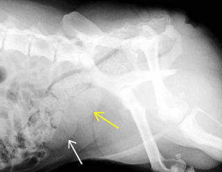 | 患者さんは未去勢雄、5歳のコーギーです。血尿が続いたため、当院を受診されました。初診時の尿検査で、色調は正常であったにもかかわらず、強い潜血反応を認め、塗抹でも赤血球を多数認めました(表参照)。前立腺肥大を疑い、肛門より触診を実施しました。その結果、表面がスムースでプクンとした感じの前立腺が触知され、レントゲン検査でも、前立腺の肥大を示す陰影を認めたことから(写真参照)、前立腺肥大と診断しました。 前立腺肥大の治療には精巣を摘出する外科的療法(去勢手術)が最も効果的であることを説明し、外科的療法を選択しました。 初診時に去勢手術を実施し、抗生物質(オルビフロキサシン)を処方しました。手術後、排尿がこれまでよりスムーズにできるようになり、尿がきれいになったとのことでした。ところが1週間後に、高度の血尿を示したため再受診されました。尿検査成績に示したように、尿は赤色を呈し、塗抹染色標本で白血球を中程度、細菌を少量認めたことから、膀胱炎を併発したものと診断、抗生物質をアンピシリンに切り替え処方しました。2週目以降には潜血反応もなくなり、膀胱炎の痕跡と考えられる上皮細胞も徐々に減数しました。3カ月以上続いていた血尿は、去勢手術後、完治することができました。 |