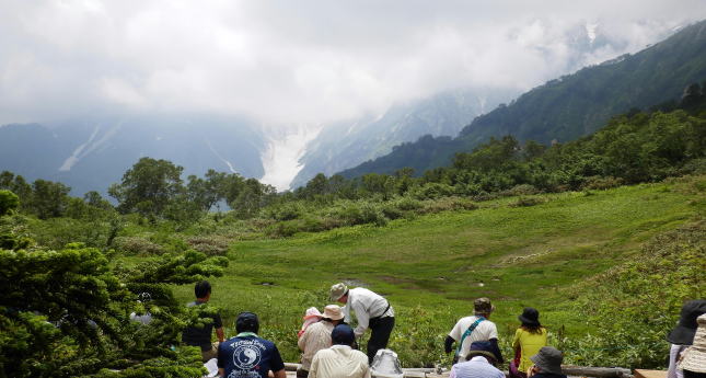 | 標高2,010mの展望湿原、正面に見えるのは杓子岳の大雪渓。 | |