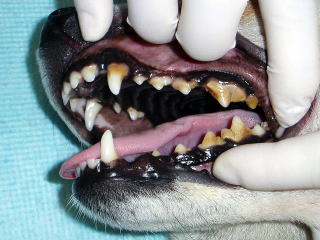 | 人と同様に、犬も口腔内の衛生管理はとても重要です。とくに歯に付着した歯石を放置すると、歯肉炎や歯槽膿漏の原因となり、歯の健康を著しく悪化させます。歯の汚れたところには、たくさんの菌が増殖し、口臭も強くなります。また眼窩下膿瘍(がんかかのうよう)といって、奥歯の歯槽内で増殖した菌が、眼の近くに膿瘍を作って、顔面から膿が出ることもあります。 歯の健康を守るため、当院では超音波スケーラーを使用して、歯石除去を実施しています。左の写真が歯石を除去する前ですが、除去後には右の写真のように、とてもきれいになります。歯石の付着を予防するには日頃の管理も大切ですので、気軽にご相談ください。 |